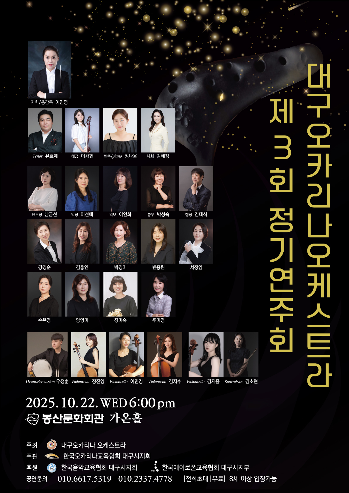 공연일정 홈 공연 공연일정 2025년 2026년 2025년 2024년 2023년 2022년 2021년 2020년 2019년 2018년 2017년 2016년 2015년 2014년 2013년 2012년 2011년 2010년 2009년 2008년 2007년 2006년 2005년 All 1월 2월 3월 4월 5월 6월 7월 8월 9월 10월 11월 12월 검색 공연검색 제목 장소 선택하세요 가온홀 스페이스라온 야외공연장 회관앞광장 날짜 2025 2025 2025 2025 2025 2025 2025 2025 2025 2025 2025 2025 2025 2025 2025 2025 2025 2025 2025 2025 2025 2025 년 월 1 2 3 4 5 6 7 8 9 10 11 12 월 일 1 2 3 4 5 6 7 8 9 10 11 12 13 14 15 16 17 18 19 20 21 22 23 24 25 26 27 28 29 30 31 일 ~ 검색 년도 2004 2005 2006 2007 2008 2009 2010 2011 2012 2013 2014 2015 2016 2017 2018 2019 2020 2021 2022 2023 2024 2025 2026 년 검색 월 1 2 3 4 5 6 7 8 9 10 11 12 월 검색 일 1 2 3 4 5 6 7 8 9 10 11 12 13 14 15 16 17 18 19 20 21 22 23 24 25 26 27 28 29 30 31 일 마감 공연명대구오카리나 오케스트라 제3회 정기연주회 공연기간2025년 10월 22일(수) ~ 2025년 10월 22일(수) 공연시간18:00 관람료전석 무료 공연장소가온홀 관람등급8세 이상 소요시간90분 장르클래식 문의대구오카리나오케스트라 010-6617-5319, 010-2337-4778 공연정보 목록