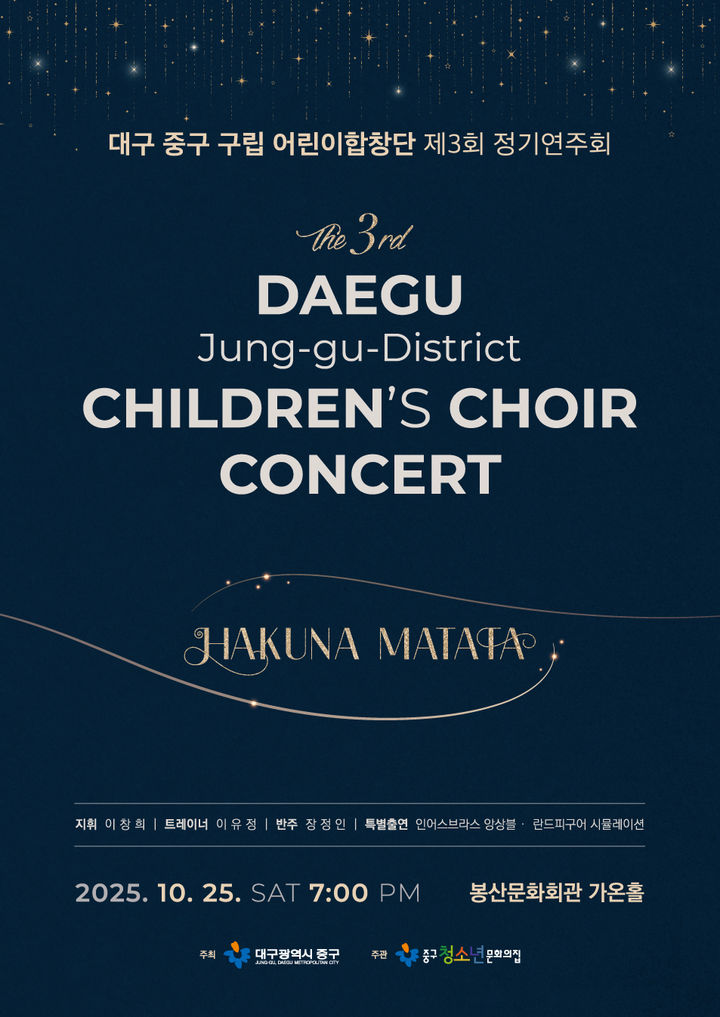 공연일정 홈 공연 공연일정 2025년 2026년 2025년 2024년 2023년 2022년 2021년 2020년 2019년 2018년 2017년 2016년 2015년 2014년 2013년 2012년 2011년 2010년 2009년 2008년 2007년 2006년 2005년 All 1월 2월 3월 4월 5월 6월 7월 8월 9월 10월 11월 12월 검색 공연검색 제목 장소 선택하세요 가온홀 스페이스라온 야외공연장 회관앞광장 날짜 2025 2025 2025 2025 2025 2025 2025 2025 2025 2025 2025 2025 2025 2025 2025 2025 2025 2025 2025 2025 2025 2025 년 월 1 2 3 4 5 6 7 8 9 10 11 12 월 일 1 2 3 4 5 6 7 8 9 10 11 12 13 14 15 16 17 18 19 20 21 22 23 24 25 26 27 28 29 30 31 일 ~ 검색 년도 2004 2005 2006 2007 2008 2009 2010 2011 2012 2013 2014 2015 2016 2017 2018 2019 2020 2021 2022 2023 2024 2025 2026 년 검색 월 1 2 3 4 5 6 7 8 9 10 11 12 월 검색 일 1 2 3 4 5 6 7 8 9 10 11 12 13 14 15 16 17 18 19 20 21 22 23 24 25 26 27 28 29 30 31 일 마감 공연명2025 대구중구구립 어린이합창단 제3회 정기연주회 공연기간2025년 10월 25일(토) ~ 2025년 10월 25일(토) 공연시간19:00 관람료전석 무료 공연장소가온홀 관람등급전체 관람가 소요시간90분 장르클래식 문의문화교육과 053-661-2178 공연정보 목록