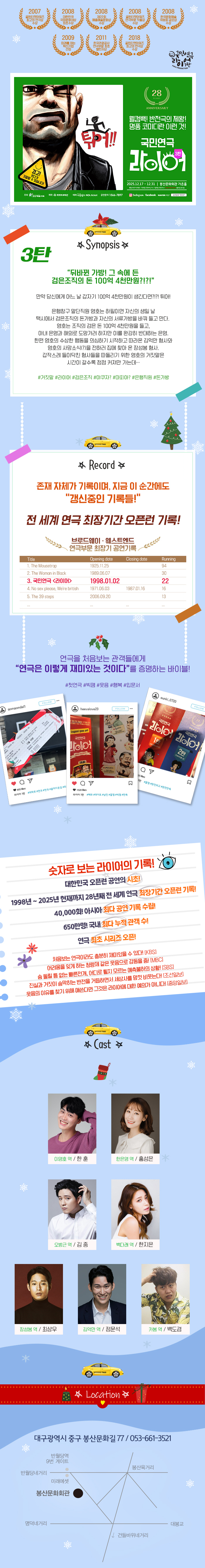 공연일정 홈 공연 공연일정 2025년 2026년 2025년 2024년 2023년 2022년 2021년 2020년 2019년 2018년 2017년 2016년 2015년 2014년 2013년 2012년 2011년 2010년 2009년 2008년 2007년 2006년 2005년 All 1월 2월 3월 4월 5월 6월 7월 8월 9월 10월 11월 12월 검색 공연검색 제목 장소 선택하세요 가온홀 스페이스라온 야외공연장 회관앞광장 날짜 2025 2025 2025 2025 2025 2025 2025 2025 2025 2025 2025 2025 2025 2025 2025 2025 2025 2025 2025 2025 2025 2025 년 월 1 2 3 4 5 6 7 8 9 10 11 12 월 일 1 2 3 4 5 6 7 8 9 10 11 12 13 14 15 16 17 18 19 20 21 22 23 24 25 26 27 28 29 30 31 일 ~ 검색 년도 2004 2005 2006 2007 2008 2009 2010 2011 2012 2013 2014 2015 2016 2017 2018 2019 2020 2021 2022 2023 2024 2025 2026 년 검색 월 1 2 3 4 5 6 7 8 9 10 11 12 월 검색 일 1 2 3 4 5 6 7 8 9 10 11 12 13 14 15 16 17 18 19 20 21 22 23 24 25 26 27 28 29 30 31 일 전화문의 공연명국민연극 [라이어 3탄 튀어!] 공연기간2025년 12월 17일(수) ~ 2025년 12월 31일(수) 공연시간평일 19:30 / 토 16:00, 19:00 / 일 15:00 관람료전석 50,000원 공연장소가온홀 관람등급중학생 이상 소요시간100분 장르연극 문의고도예술기획 1566-7897 공연정보 ※ 주차장이 매우 협소하오니 대중교통 이용바랍니다. 목록