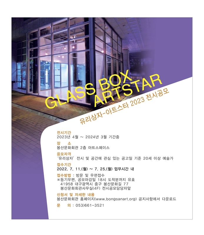 2. 장 소 : 봉산문화회관 2층 아트스페이스 3. 응모자격 : ‘유리상자’ 전시 및 공간에 관심 있는 공고일 기준 20세 이상 예술가 4. 접수기간 : 2022. 7. 11.(월) ~ 7. 25.(월) 업무시간 내 5. 응모방법 : 방문 접수 및 등기우편(공모 마감일 18시 도착분까지 유효) 6. 제출자료 7. 선정심사 절차 : 자료심사→작가인터뷰→최종발표(선정작가 홈페이지 및 개별통보) 8. 선정작가 지원 9. 유의사항 10. 문 의 : 053)661-3521