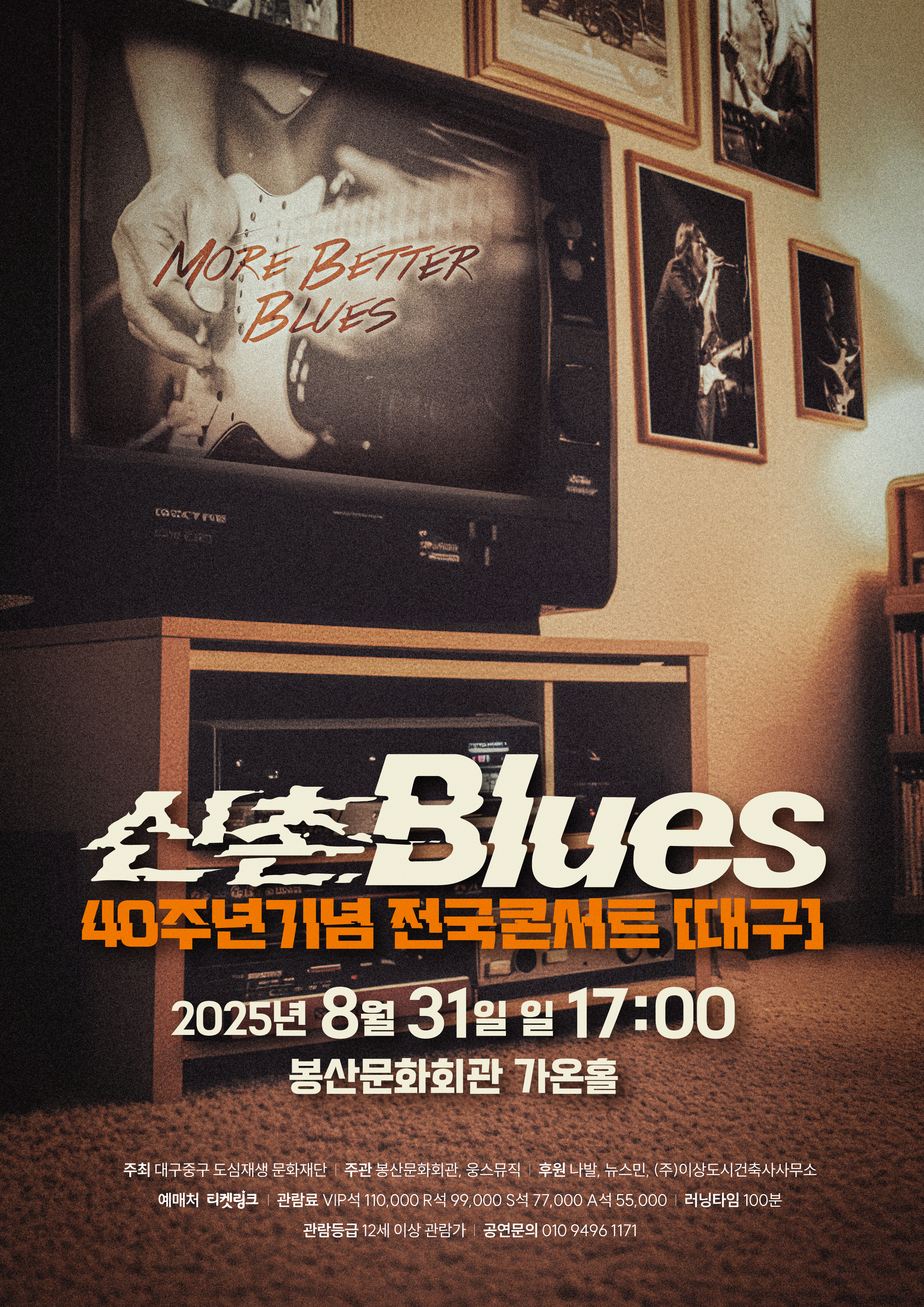 공연일정 홈 공연 공연일정 2025년 2026년 2025년 2024년 2023년 2022년 2021년 2020년 2019년 2018년 2017년 2016년 2015년 2014년 2013년 2012년 2011년 2010년 2009년 2008년 2007년 2006년 2005년 All 1월 2월 3월 4월 5월 6월 7월 8월 9월 10월 11월 12월 검색 공연검색 제목 장소 선택하세요 가온홀 스페이스라온 야외공연장 회관앞광장 날짜 2025 2025 2025 2025 2025 2025 2025 2025 2025 2025 2025 2025 2025 2025 2025 2025 2025 2025 2025 2025 2025 2025 년 월 1 2 3 4 5 6 7 8 9 10 11 12 월 일 1 2 3 4 5 6 7 8 9 10 11 12 13 14 15 16 17 18 19 20 21 22 23 24 25 26 27 28 29 30 31 일 ~ 검색 년도 2004 2005 2006 2007 2008 2009 2010 2011 2012 2013 2014 2015 2016 2017 2018 2019 2020 2021 2022 2023 2024 2025 2026 년 검색 월 1 2 3 4 5 6 7 8 9 10 11 12 월 검색 일 1 2 3 4 5 6 7 8 9 10 11 12 13 14 15 16 17 18 19 20 21 22 23 24 25 26 27 28 29 30 31 일 마감 공연명공동기획, 신촌블루스 40주년기념 전국콘서트 공연기간2025년 08월 31일(일) ~ 2025년 08월 31일(일) 공연시간17:00 관람료VIP석 110,000원, R석 99,000원, S석 77,000원, A석 55,000원 공연장소가온홀 관람등급12세 이상 소요시간100분 장르대중음악 문의웅스뮤직 010-9496-1171 공연정보 목록