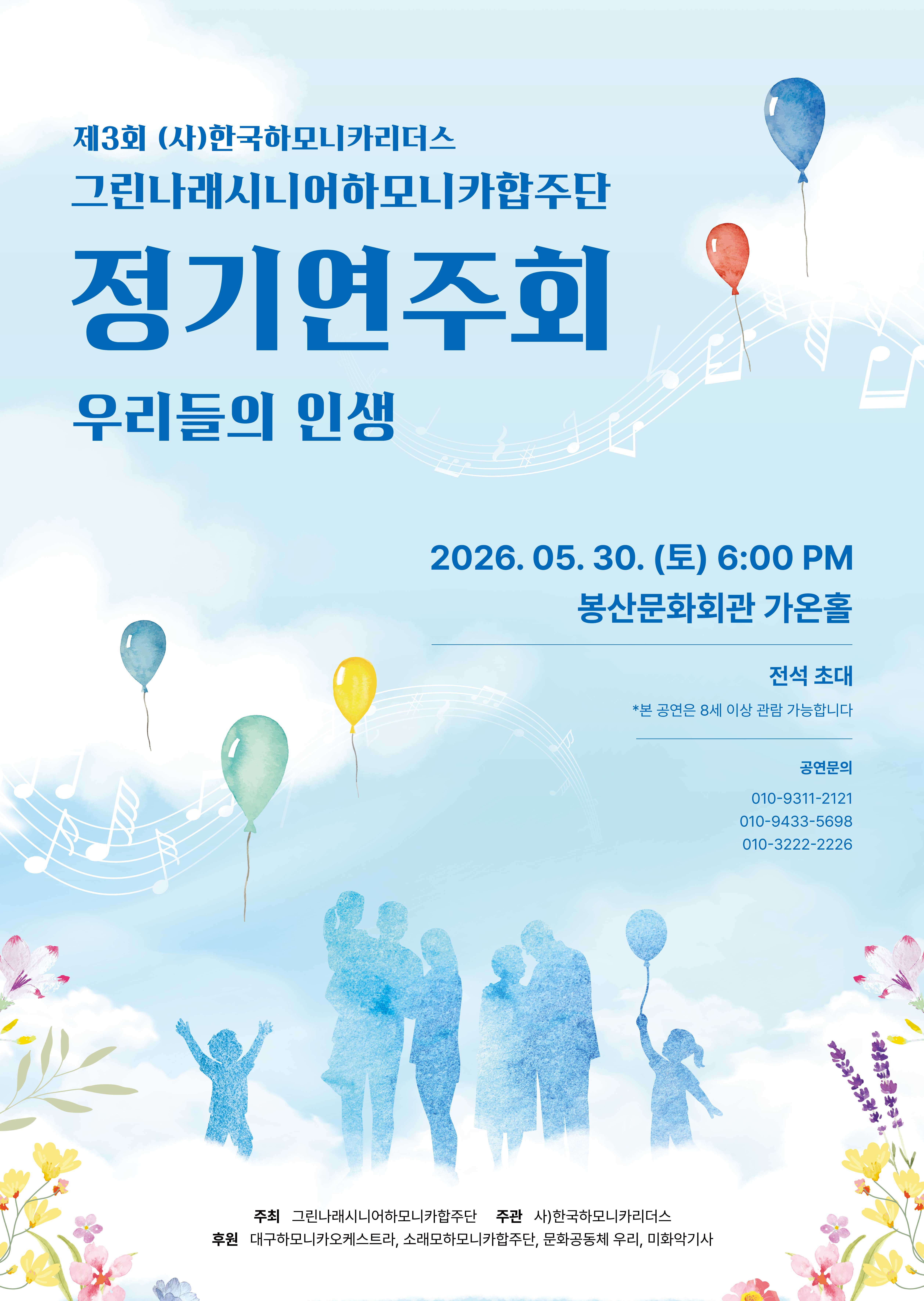 공연일정 홈 공연 공연일정 2026년 2027년 2026년 2025년 2024년 2023년 2022년 2021년 2020년 2019년 2018년 2017년 2016년 2015년 2014년 2013년 2012년 2011년 2010년 2009년 2008년 2007년 2006년 2005년 All 1월 2월 3월 4월 5월 6월 7월 8월 9월 10월 11월 12월 검색 공연검색 제목 장소 선택하세요 가온홀 스페이스라온 야외공연장 회관앞광장 날짜 2026 2026 2026 2026 2026 2026 2026 2026 2026 2026 2026 2026 2026 2026 2026 2026 2026 2026 2026 2026 2026 2026 2026 년 월 1 2 3 4 5 6 7 8 9 10 11 12 월 일 1 2 3 4 5 6 7 8 9 10 11 12 13 14 15 16 17 18 19 20 21 22 23 24 25 26 27 28 29 30 31 일 ~ 검색 년도 2004 2005 2006 2007 2008 2009 2010 2011 2012 2013 2014 2015 2016 2017 2018 2019 2020 2021 2022 2023 2024 2025 2026 2027 년 검색 월 1 2 3 4 5 6 7 8 9 10 11 12 월 검색 일 1 2 3 4 5 6 7 8 9 10 11 12 13 14 15 16 17 18 19 20 21 22 23 24 25 26 27 28 29 30 31 일 전화문의 공연명제3회 그린나래시니어하모니카합주단 정기연주회 공연기간2026년 05월 30일(토) ~ 2026년 05월 30일(토) 공연시간18:00 관람료전석 초대 공연장소가온홀 관람등급8세 이상 소요시간90분 장르클래식 문의(사)한국하모니카리더스 010-9311-2121 공연정보 목록